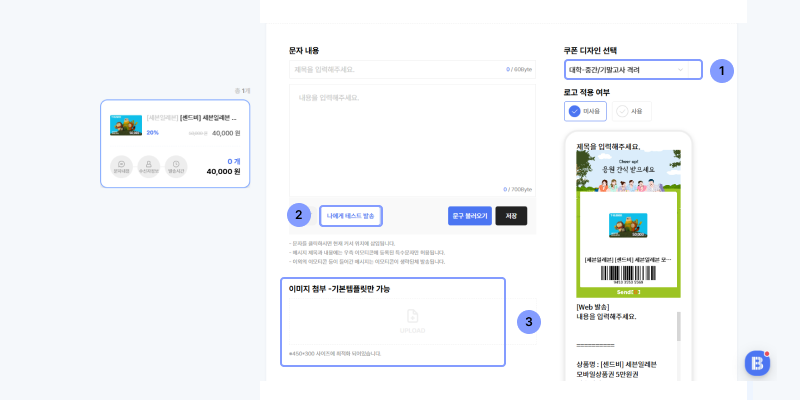 step 2. 문자 메세지 / 쿠폰 템플릿 / 로고 삽입 / 연락처 파일 업로드하기