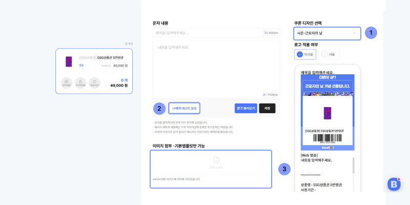 step 2. 문자 메세지 / 쿠폰 템플릿 / 로고 삽입 / 연락처 파일 업로드하기